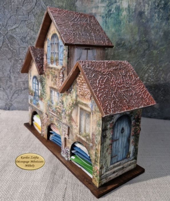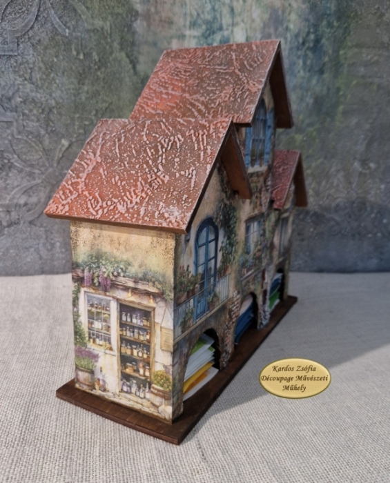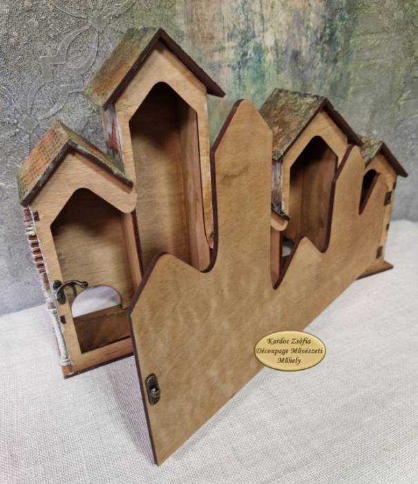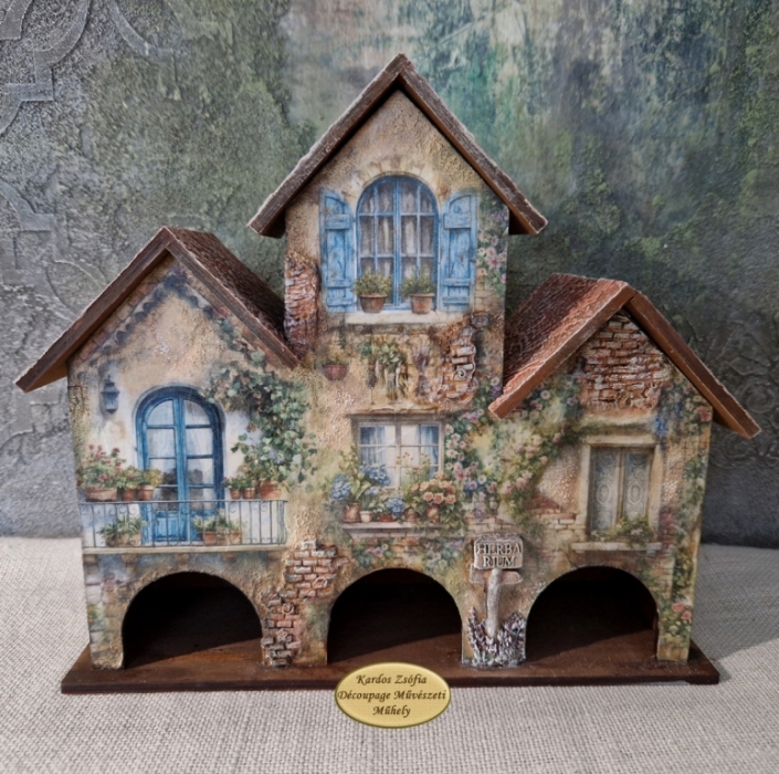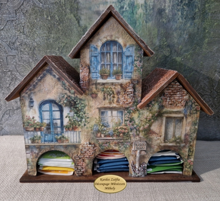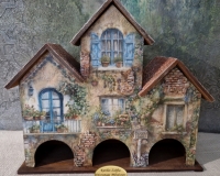 Hátul nyitható és zárható, 3 házból álló városrészlet, teafilter tartó funkcióval, provanszi hanulatú dekorációval.