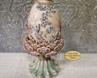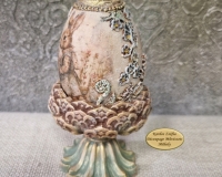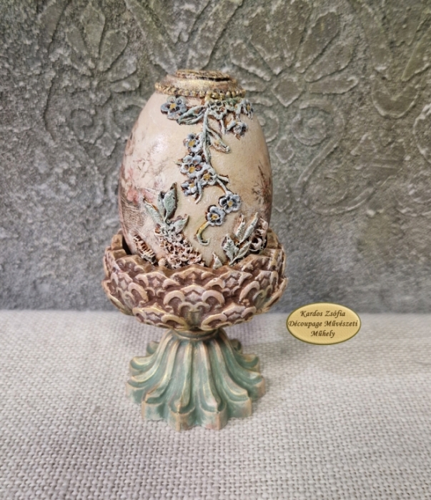 Technikák: a tojás dekorációja egyedi rizspapírokkal. Háttérfestés, antikolás, a tojás díszítése flexibilis paszta virágokkal, növényi ornamentekkel.Műgyanta öntvény festése, színezése, antikolása különböző Cadence festékekkel és antikoló termékekkel