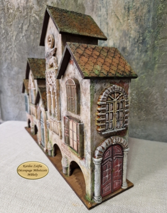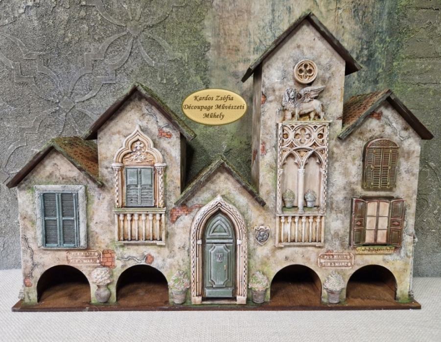 Technikák: 3 D öntvényekkel kombinált rizspapíros alap kialakítása. Omladozott házfal imitációjának elkészítése stencilezéssel, kőpasztával, 3 féle antikolási technika ötvözésével. Az öntvények színezésénél szintén többféle terméket és antikolási technikát alkalmazunk. "Házimádóknak" igazi kuriózum és kötelező darab!