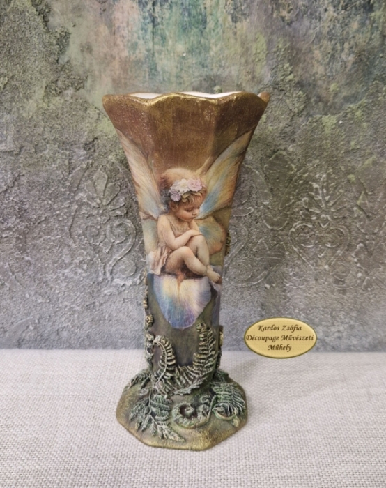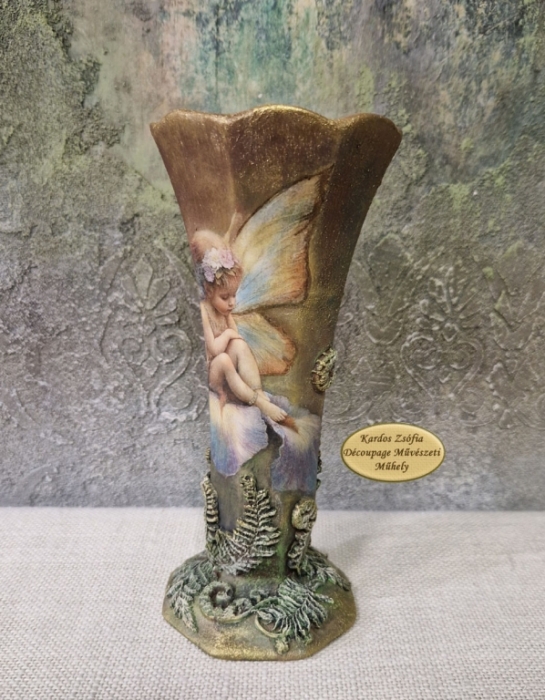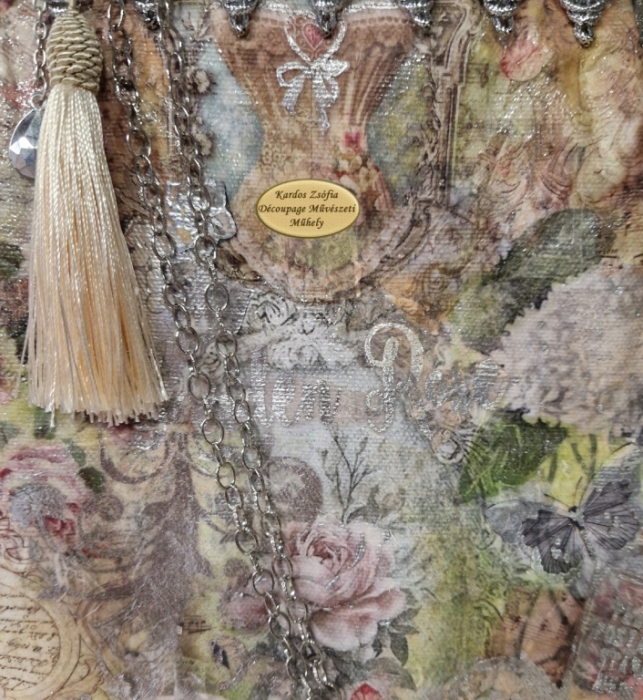 Technikák: egyedi, a tárgyhoz tervezett rizspapírokkal rizspapíros dekoráció összeállítása. Levegőn száradó gyurmából készült 3 D-s részletek. Különböző színezési és antikolási technikák. "Házimádóknak" igazi kuriózum és kötelező darab!