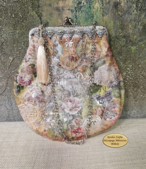 Igényes, kézi varrású, belül bélelt estélyi táska textilből, csiptetős fémzárral, fémláncos fogantyúval.