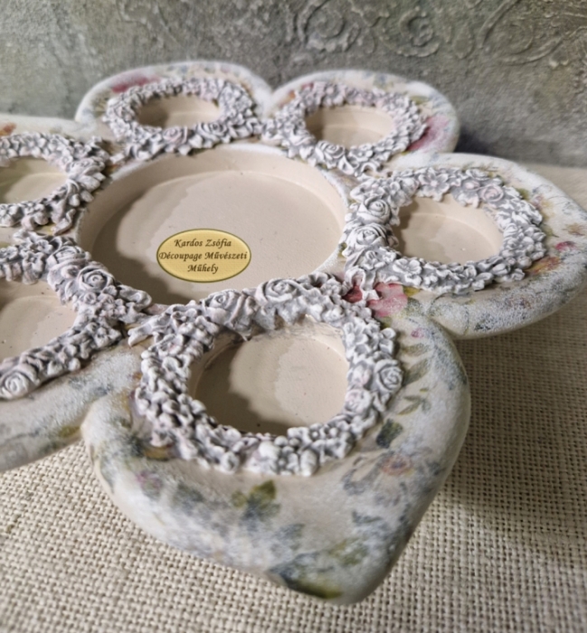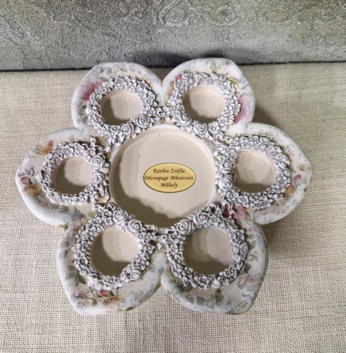 Fehér kerámia alapra készült különleges dekoráció.Figyelem! Az alapanyag csak korlátozott db számban áll rendelkezésre, ezért a tárgyhoz az alapanyag foglalása szükséges.