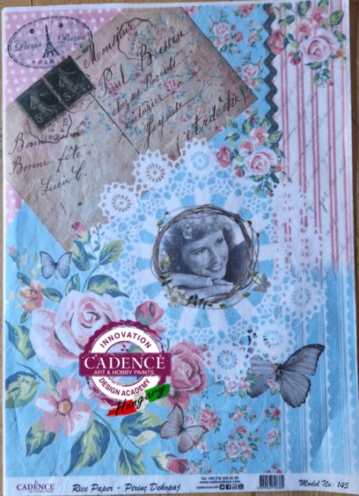 A3-s méretű rizspapír, découpage technikához. Felragasztásához a Découpage Plus ragasztót használd, a kész munkát vízbázisú akril lakkal védd le.