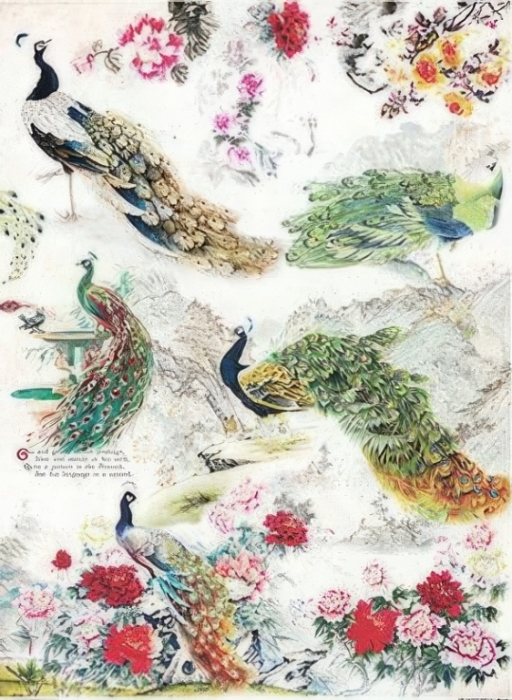 A3-s méretű rizspapír, découpage technikához. Felragasztásához a Découpage Plus ragasztót használd, a kész munkát vízbázisú akril lakkal védd le.