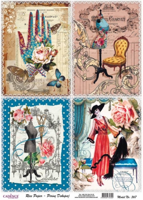 A3-s méretű rizspapír, découpage technikához. Felragasztásához a Découpage Plus ragasztót használd, a kész munkát vízbázisú akril lakkal védd le.