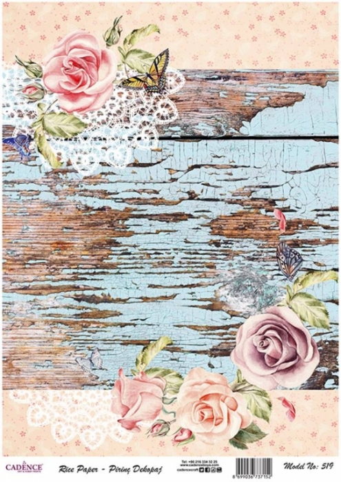 A3-s méretű rizspapír, découpage technikához. Felragasztásához a Découpage Plus ragasztót használd, a kész munkát vízbázisú akril lakkal védd le.