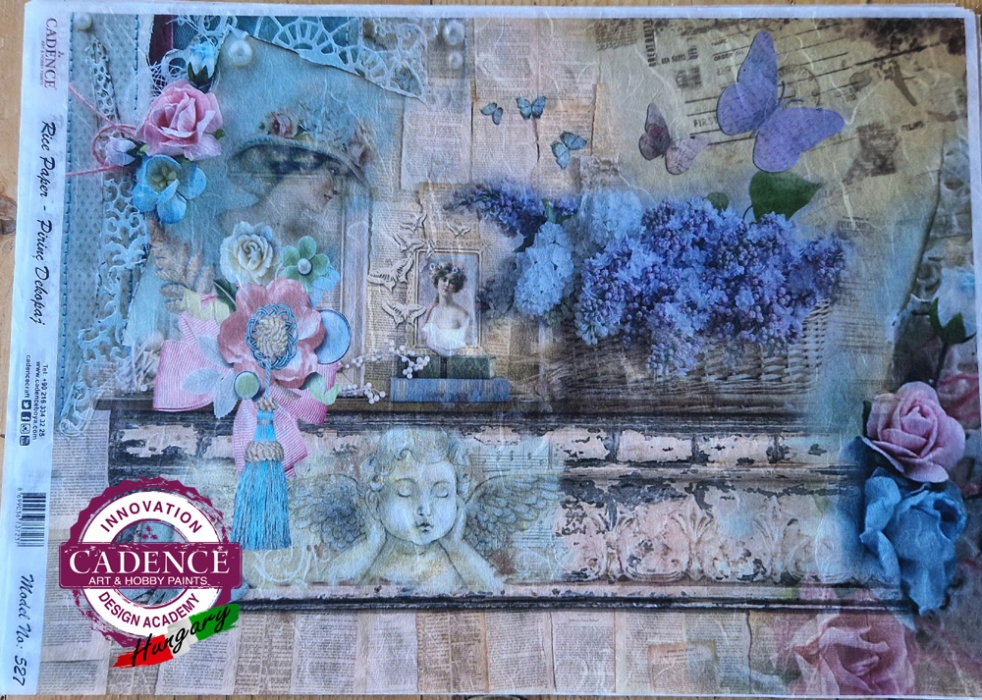 A3-s méretű rizspapír, découpage technikához. Felragasztásához a Découpage Plus ragasztót használd, a kész munkát vízbázisú akril lakkal védd le.