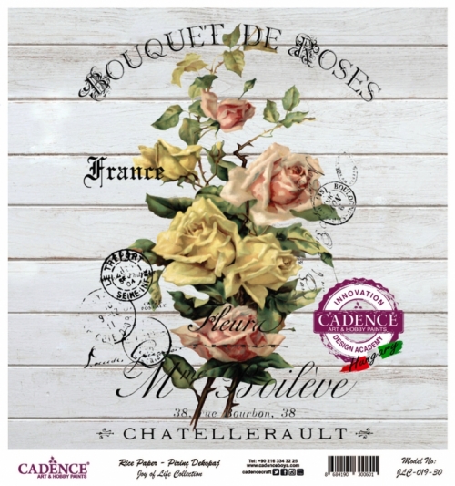32 x 32 cm méretű rizspapír, découpage technikához. Felragasztásához a Découpage Plus ragasztót használd, a kész munkát vízbázisú akril lakkal védd le.