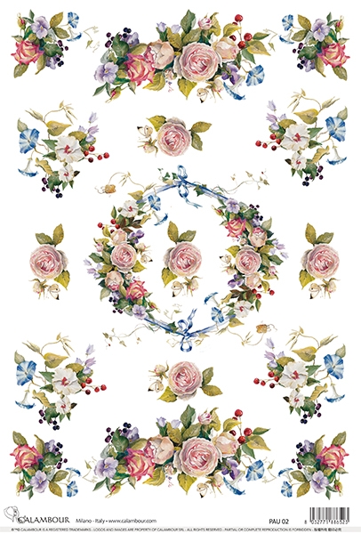 A3-s méretű rizspapír, découpage technikához. Felragasztásához a Découpage Plus ragasztót használd, a kész munkát vízbázisú akril lakkal védd le.