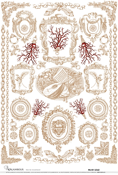 A3-s méretű rizspapír, gyönyörű, filigrán arany füstfóliás részletekkel, découpage technikához. Felragasztásához a Découpage Plus ragasztót használd, a kész munkát vízbázisú akril lakkal védd le.