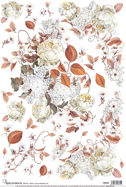 A3-s méretű rizspapír, découpage technikához. Felragasztásához a Découpage Plus ragasztót használd, a kész munkát vízbázisú akril lakkal védd le.