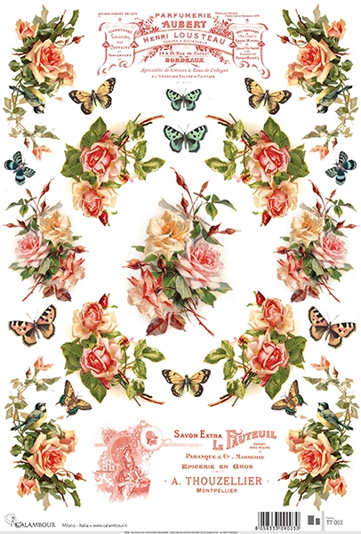 A4-s méretű rizspapír, découpage technikához. Felragasztásához a Découpage Plus ragasztót használd, a kész munkát vízbázisú akril lakkal védd le.