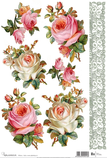 A4-s méretű rizspapír, découpage technikához. Felragasztásához a Découpage Plus ragasztót használd, a kész munkát vízbázisú akril lakkal védd le.