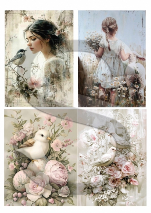 A4-s méretű, 20 gr-s rizspapírra készült, egyedi tervezésű és nyomtatású rizspapír, découpage technikához. Felragasztásához a Découpage Plus ragasztót használd, a kész munkát vízbázisú akril lakkal védd le.