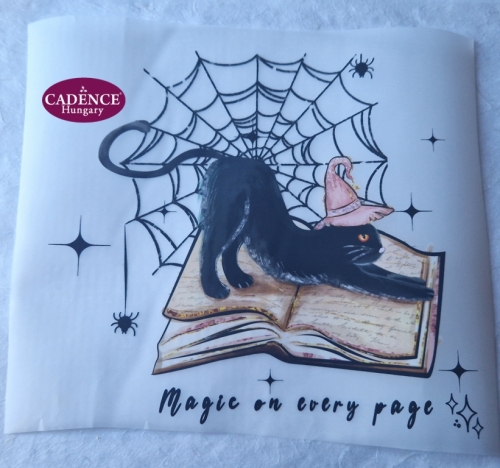 Egyedi textil transzfer – Boszorkánykönyv és fekete macska