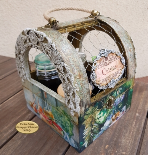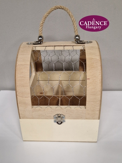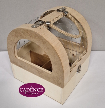 Felhajtható tetejű tároló tyúkketreces betéttel, négy rekeszes tároló résszel, dekoratív fém elemekkel, zsinóros fogantyúval. Alapanyaga: fa + acélhaló. Méretei: magasság 23 cm, mélység 21 cm, szélesség 19 cm.