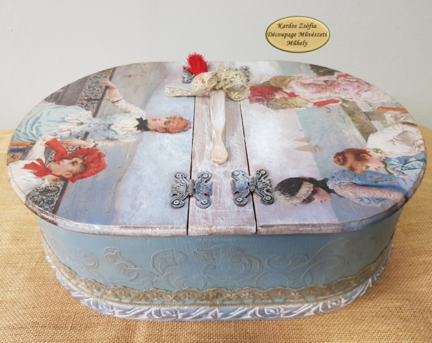 Nagy méretű, osztott belsejű, kétoldalról külön felnyitható tetejű doboz découpage és mix media dekorációkhoz. Alapanyag fa. Műanyag fogóval, díszes fémzsanérokkal. Méretei: magasság 13 cm, legnagyobb szélesség 30 cm, hosszúság 42 cm.