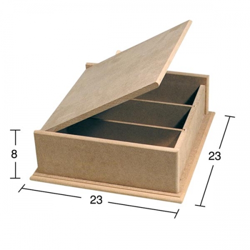 Felhajtható tetejű, három rekeszes teafilter tároló doboz. Alapanyaga MDF. Méretei: magasság 8 cm, alapja 23 x 23 cm.