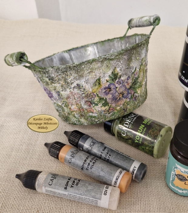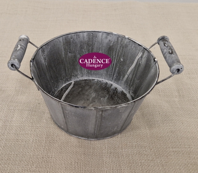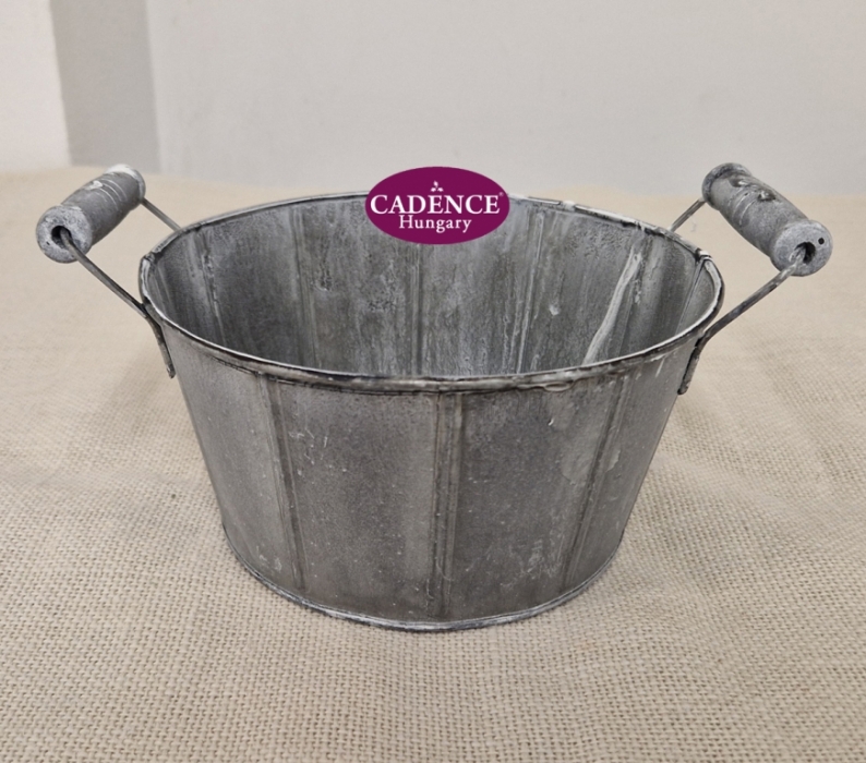 Bádogból készült kaspó, két füllel. Mérete: magassága 11 cm, átmérője 17 cm, füllel 20 cm. Découpage vagy virágkötészeti dekorációkhoz.