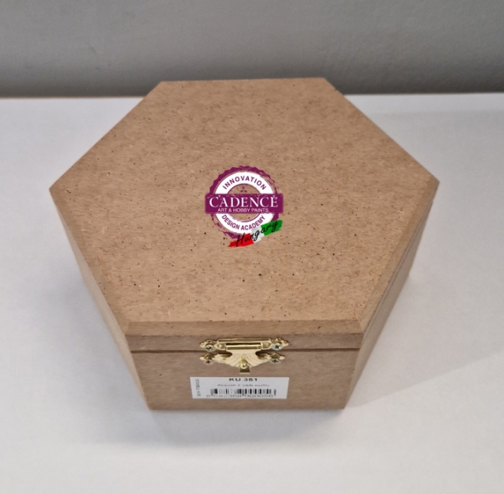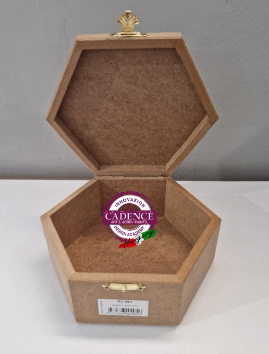Hatszögletű doboz, minőségi kivitelezésben, díszcsattal. Alapanyaga MDF. Méretei: magasság 7 cm, mélység 17 cm, szélesség 15 cm.