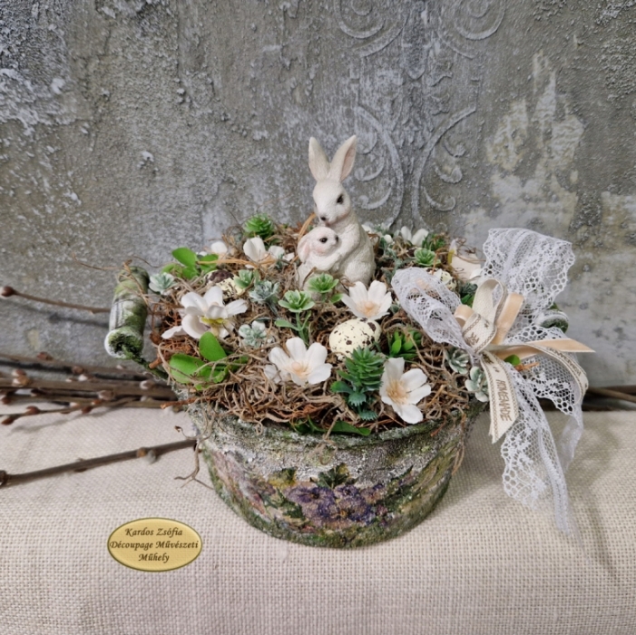 Bádogkaspóba épített fészek, száraz és mű növényekkel, nyuszifigurával. Rusztikus dekoráció: découpage technika beton és moha effekttel, antikolással, csipke, szalag, díszítésekkel.