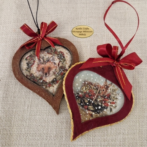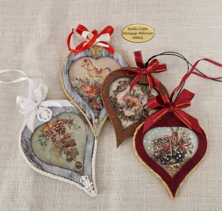 4 db fából készült filigrán dísz csomagban (mérete 10 x 16 és 10 x 13 cm, 2-2 db) hozzá szerkesztett és méretezett rizspapírral (3.fotón) A csomagból mutatós karácsonyfa díszeket készíthetsz, elkészítési ötletek a 4-5-6. fotókon.