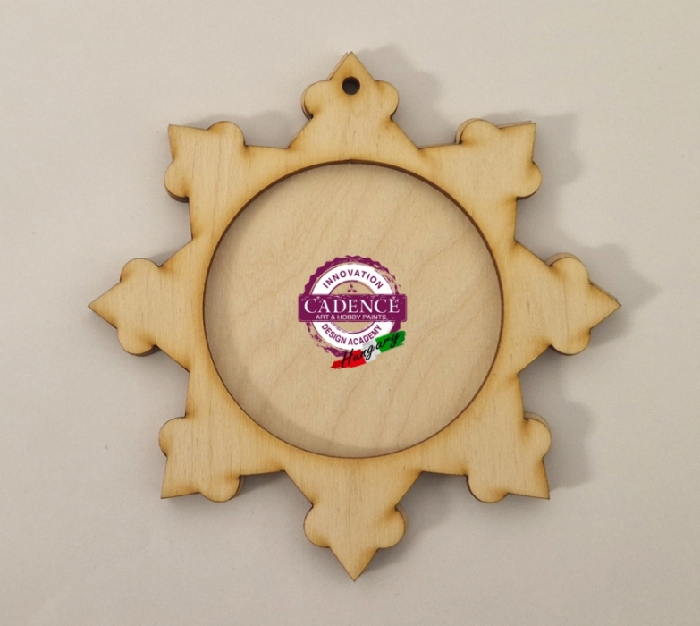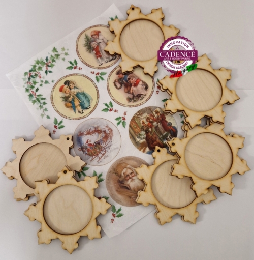 6 db fából készült hópehelydísz csomag (átmérője 12 cm, belső kör 7 cm) hozzá szerkesztett és méretezett country macis rizspapírral, amelyből mutatós karácsonyfa díszeket készíthetsz.