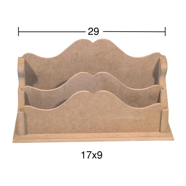 Kétrekeszes asztali levéltartó, hullámos szegéllyel. Alapanyaga MDF. Méretei: magasság 17 cm, mélység 9 cm, szélesség 29 cm.