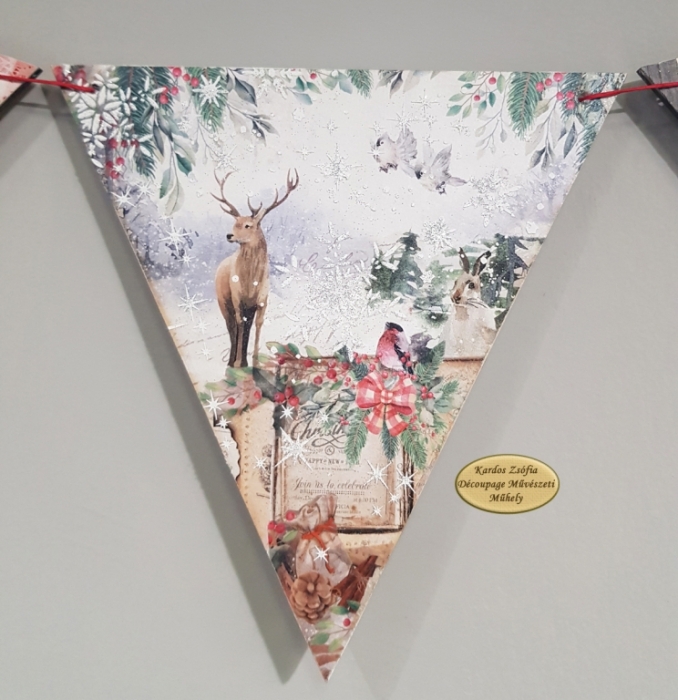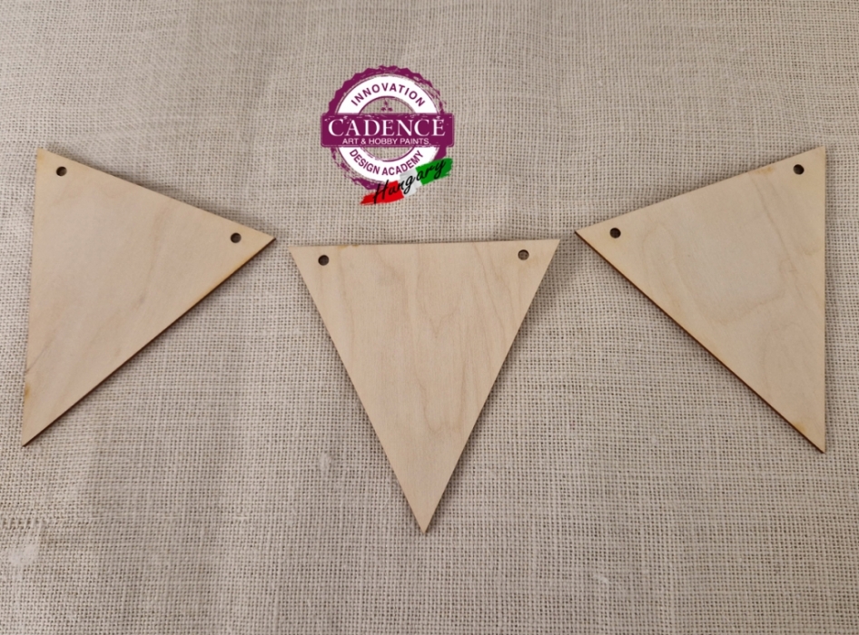 Felakasztható, összefűzhető, fából készült háromszög alakú zászló alap, ajtókopogtatóhoz, ablakdíszhez vagy más felakasztható dísz alapjának. Mérete: 15 x 14 cm , 0,33 cm vastag