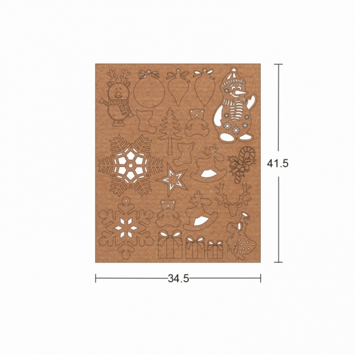 Lézervágott karácsonyi figurák 3 mm vastag MDF lapon, 21 db különböző figurával. Alapanyaga: 3 mm vastag MDF lap. Lap mérete: 34,5 x 41,5 cm.