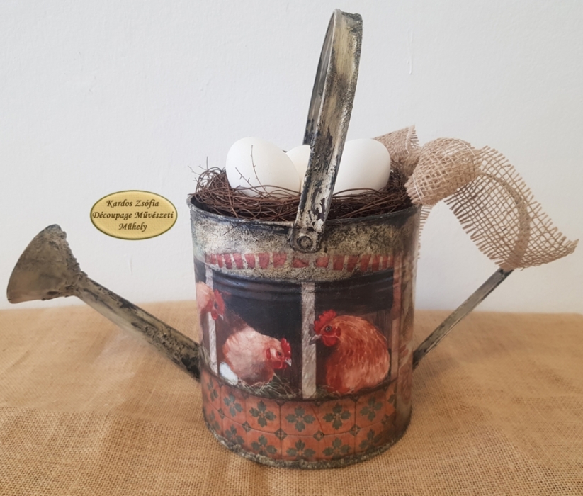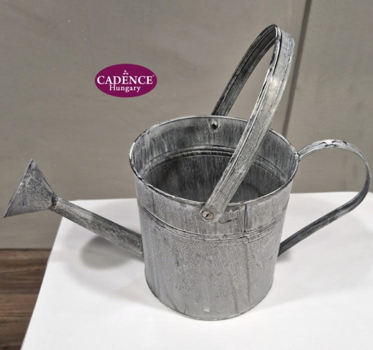 Bádogból készült locsolókanna formájú kaspó, két füllel, kanna funkciója nincsen. Mérete: legnagyobb szélessége 40 cm, átmérője 17 cm, magassága fül nélkül 17 cm, füllel 30 cm.
