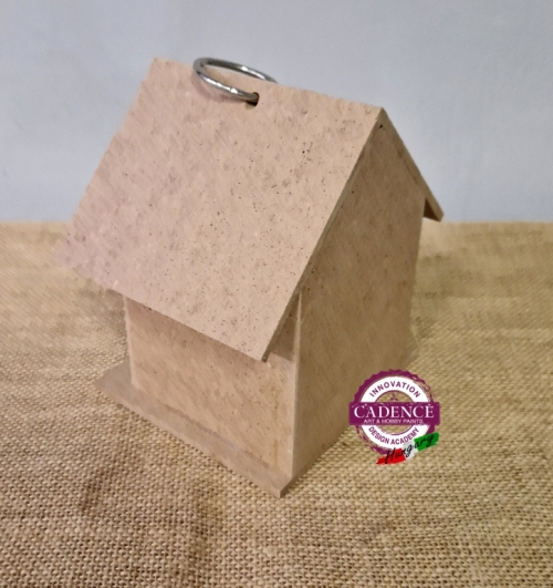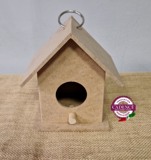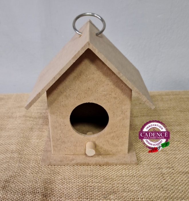 Felakasztható madárházikó. Alapanyaga MDF. Méretei: magasság 14 cm, mélység 11 cm, szélesség 13,5 cm.