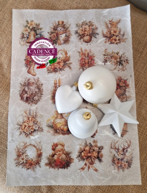 4 db, 6 cm-s mini fehér műanyag díszből álló csomag (harang, csillag, szív, gömb) hozzá szerkesztett és méretezett apró, arany mintás rizspapírral, amelyből mutatós karácsonyfa díszeket készíthetsz.