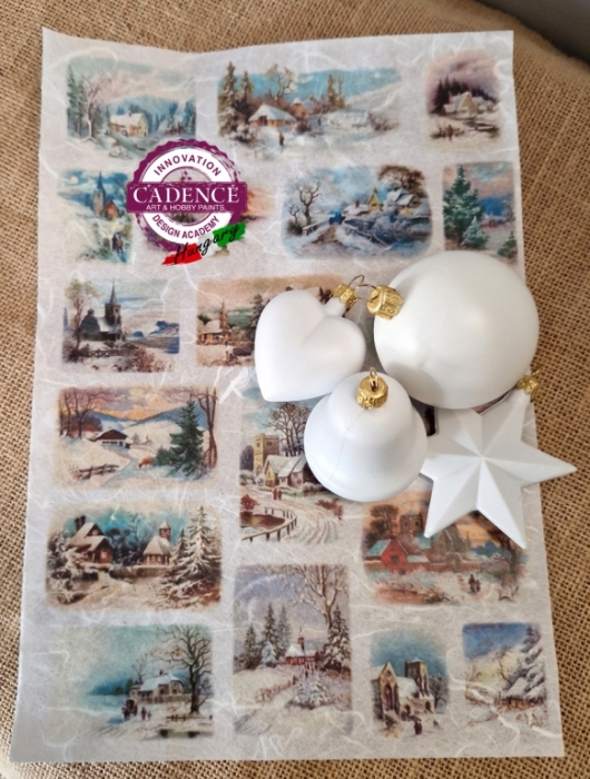 4 db, 6 cm-s mini fehér műanyag díszből álló csomag (harang, csillag, szív, gömb) hozzá szerkesztett és méretezett apró téli tájas, amelyből mutatós karácsonyfa díszeket készíthetsz.