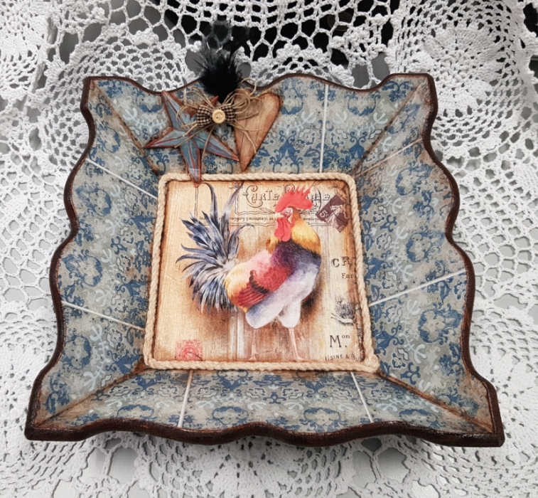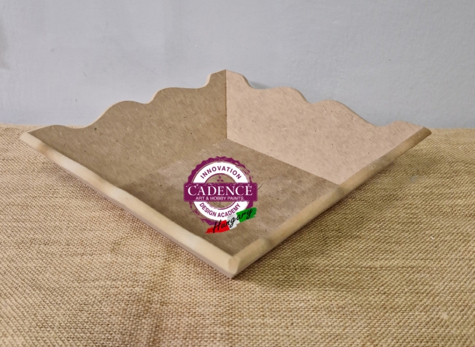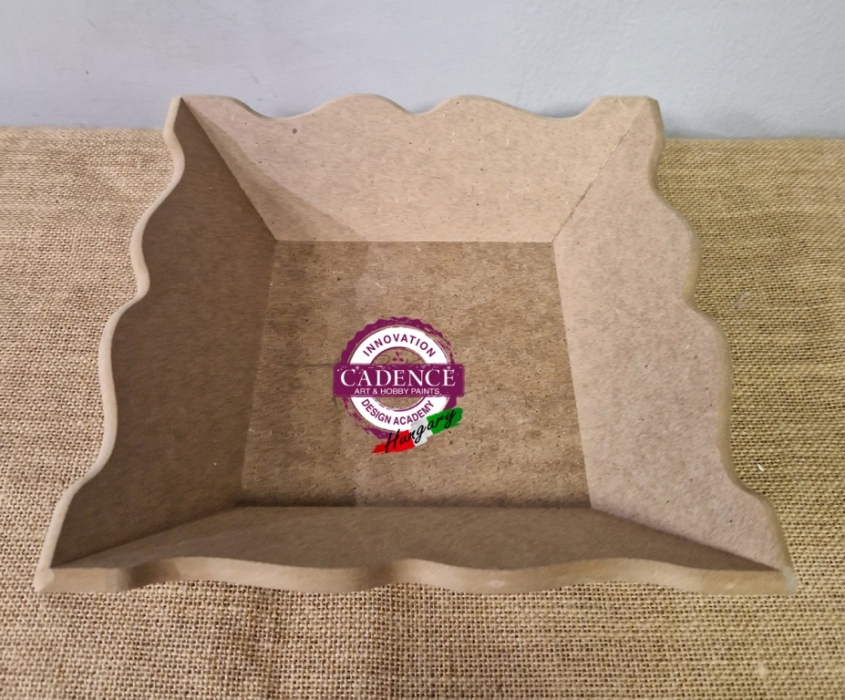 Négyszögletes tál, díszes szegéllyel. Alapanyaga MDF. Méretei: magasság 9 cm, mélység 26 cm, szélesség 26 cm.