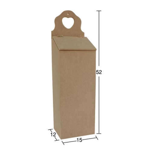 Felhajtható tetejű, praktikus, falra is akasztható, nylonzsák tároló doboz. Alapanyaga MDF. Méretei: magasság 52 cm, alapja 15 x 12 cm.