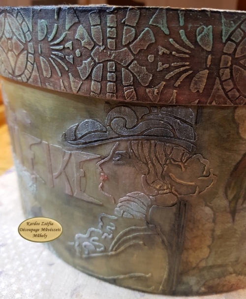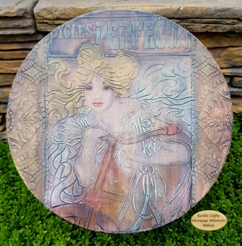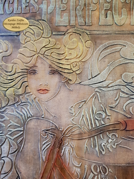 Szecessziós hangulatú dekoráció Mucha biciklis portréjával : découpage gyönyörű szecessziós rizspapírral, 3 D stencilezés, koptatott shabby részletek, antikolás.