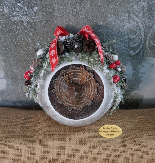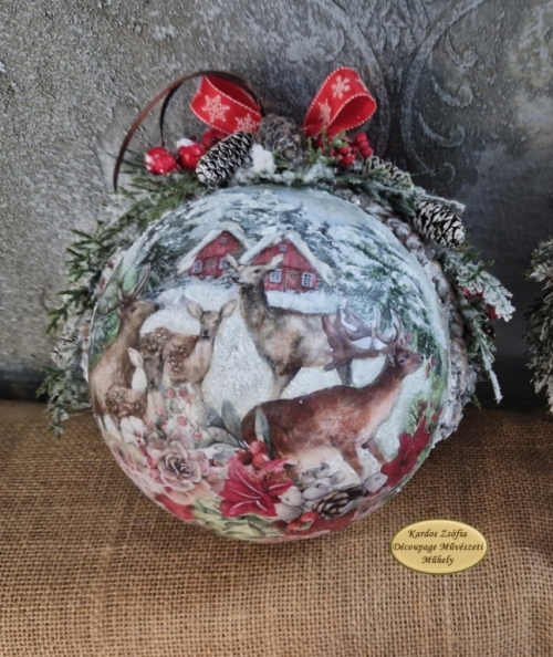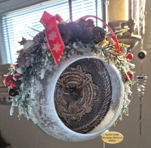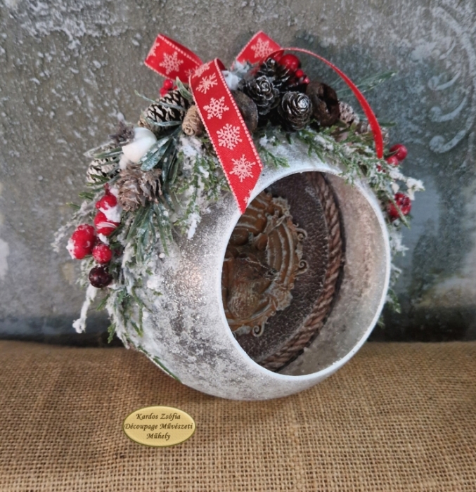 Óriás nyitott gömb, külső oldalán jeges hatású és rizspapíros díszítéssel, belsejében gyönyörű, rusztikus 3 D-s dekorációkkal. Szalag és szép művirág díszekkel. A lakás bármely pontján felakasztható karácsonyi, téli dekoráció. Alapanyaga: akril nyitott gömb. Méretei: 16 x 14 cm. Csak egyetlen darab van, belőle, rendelésre nem készül.