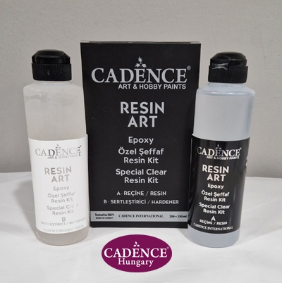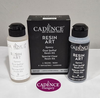 1., Bármilyen Cadence matt vagy metál akrilfestékkel, max. 1 borsónyi mennyiséget tegyünk a már összekevert gyantához és homogenizáljuk további 3 percig.
