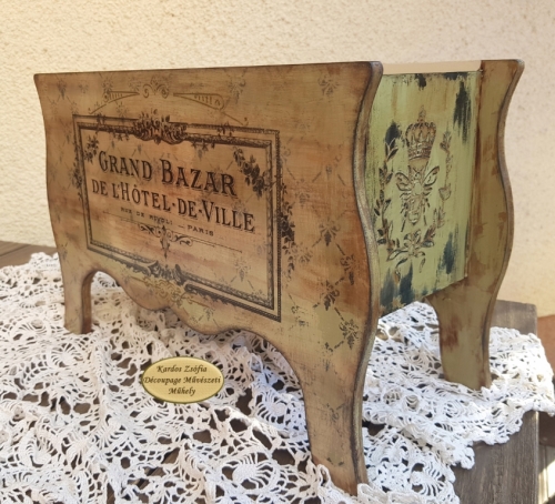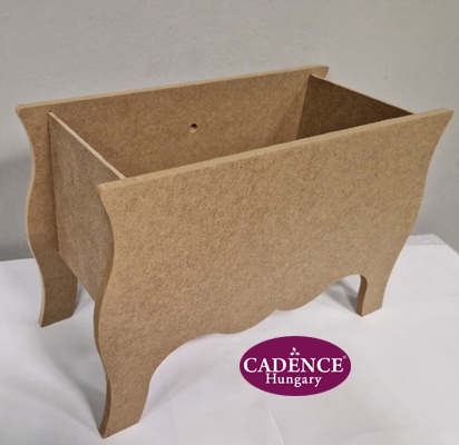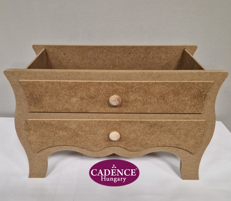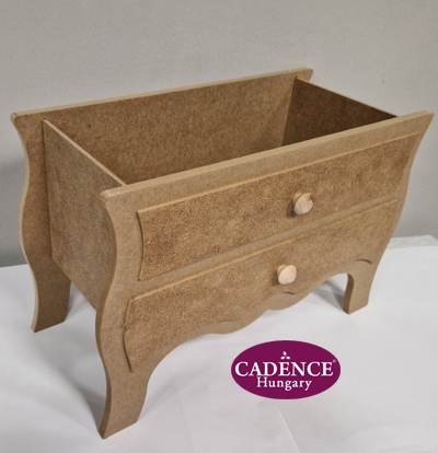 Nagy méretű, egyterű, szekrény formájú nyitott tároló, 2 díszgombbal. Alapanyaga MDF. Méretei: magasság 28 cm, mélység 18 cm, szélesség 41 cm.