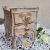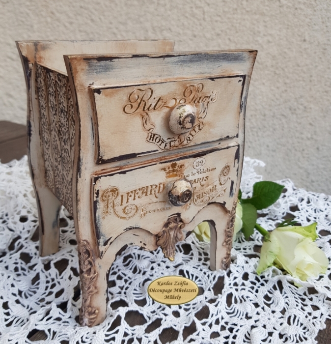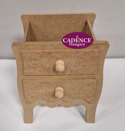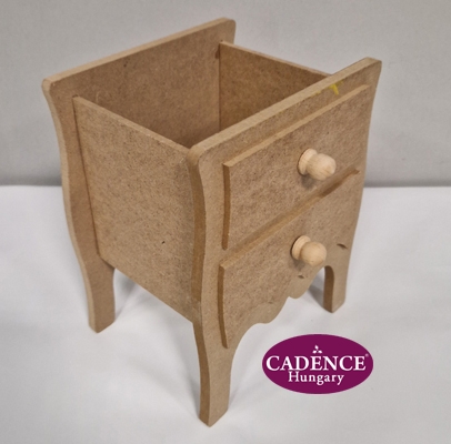 Egyterű, szekrényke formájú nyitott tároló, 2 díszgombbal. Alapanyaga MDF. Méretei: magasság 20 cm, mélység 13 cm, szélesség 16 cm.